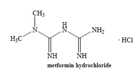 La metformina cloridrato (NN-dimetilimidodicarbonimidica diamide cloridrato) è una polvere cristallina bianca con una formula molecolare di c 4 H 11 N 5 • HCl e un peso molecolare di 165,62. La metformina cloridrato è liberamente solubile in acqua ed è praticamente insolubile nell'etere acetone e nel cloroformio. La PKA di metformina è 12,4. Il pH di una soluzione acquosa all'1% di metformina cloridrato è 6,68. La formula strutturale è come mostrata: