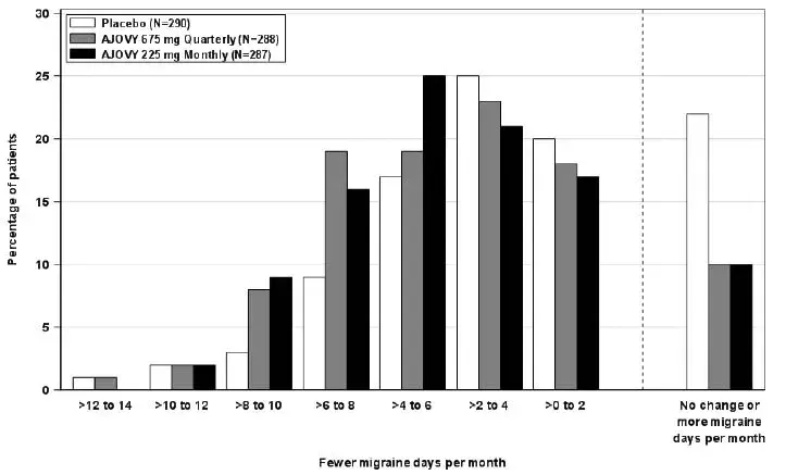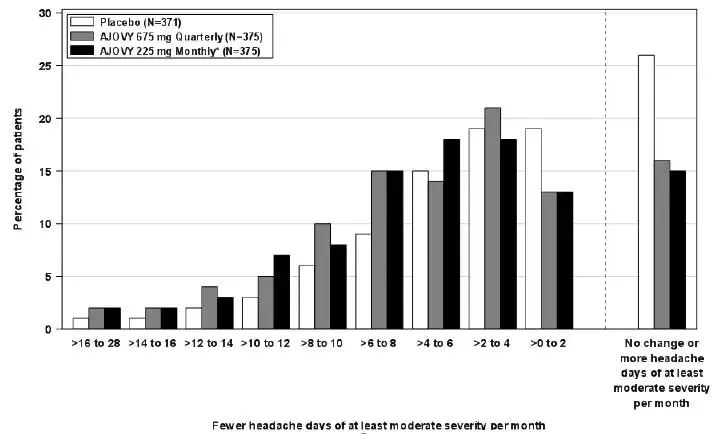 | Reazione avversa | Ajovy 225 mg Mensile (n = 290)% | Ajovy 675 mg Quarterly (n = 667)% | Placebo mensile (n = 668)% |