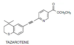 Il tazarotene è un profarmaco retinoide che viene convertito nella sua forma attiva l'acido carbossilico cognato del tazarotene (AGN 190299) mediante rapida deesterificazione negli animali e nell'uomo. AGN 190299 (acido tazarotenico) si lega a tutti e tre i membri della famiglia del recettore dell'acido retinoico (RAR): RARα RARβ e RARγ ma mostra una selettività relativa per RARβ e RARγ e può modificare l'espressione genica. Il significato clinico di questi risultati è sconosciuto.