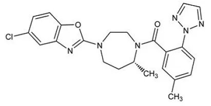 Il suvorexant è descritto chimicamente come: [(7R) -4- (5-cloro-2-benzoxazolil) hexaidro-7-metil-1H-14-4-diazepin-1-ill] [5-metil-2- (2H-123-triazol2-il) fenil] fenil] fenil] fenil] fenil] la sua formula empirica è C 23 H 23 Cln 6 O 2 e il peso molecolare è 450,92. La sua formula strutturale è: