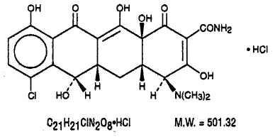 Demeclociclina cloridrato è un antibiotico isolato da un ceppo mutante di Streptomyces aureofaciens . Chimicamente è 7-cloro-4- (dimethylammino) 144A55A61112A-Octahydro-36101212a-pentaidrossi-111111-dioxo-2Naphthacenecarbossamide monoidrocloruro. La sua formula strutturale è: