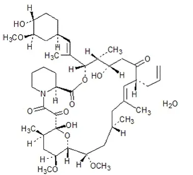 Tacrolimus ha una formula empirica di C 44 H 69 NO 12 • H. 2 O e un peso della formula di 822,03. Il tacrolimus appare come cristalli bianchi o polvere cristallina. È praticamente insolubile in acqua liberamente solubile in etanolo e molto solubile in metanolo e cloroformio.