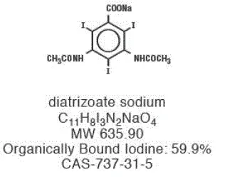 La meglumina di diatrizoato è designata chimicamente come 1-desossi-1- (metilammino) -D-glucitolo 35- Diacetamido-246-triiodo-benzoato (sale); Il sodio di diatrizoato è monosodio 3 5-diacetamido-246- triiodobenzoato. Formule strutturali: