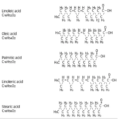 I principali acidi grassi componenti sono linoleici (44-62%) oleici (19-30%) palmitici (7-14%) linolenico (4-11%) e stearico (NULL,4-5,5%) 1. Questi acidi grassi hanno le seguenti formule chimiche e strutturali: