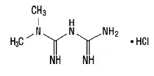La metformina cloridrato (NN-dimetilimidodicarbonimidica diamide cloridrato) è un composto cristallino da bianco a bianco sporco con una formula molecolare di C 4 H 11 N 5 • H.Cl E a molecular weight of 165.63. Metformina hydrochloride is freely soluble in water E is practically insoluble in acetone ether E chloroform. The pK a della metformina è 12,4. Il pH di una soluzione acquosa all'1% di metformina cloridrato è 6,68. La formula strutturale è come mostrata: