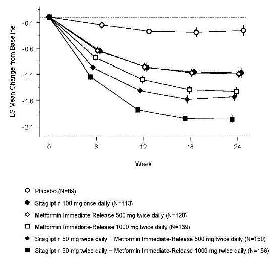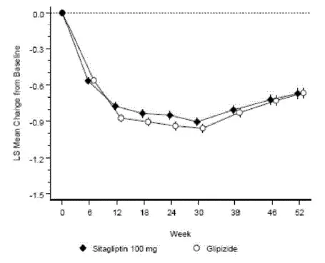 L'efficacia di Sitagliptin è stata valutata in uno studio di non inferiorità controllato da glipizide in doppio cieco di 52 settimane in pazienti con diabete di tipo 2. I pazienti non in trattamento o su altri agenti antiiperglicemici sono entrati in un periodo di trattamento in esecuzione fino a 12 settimane di durata con la monoterapia a rilascio immediato di metformina HCl (dose di ≥1500 mg al giorno) che includeva il lavaggio di farmaci diversi dalla metformina Immediatamenteelease se applicabile. Dopo il periodo di run-in quelli con controllo glicemico inadeguato (da 6,5% al 10%) sono stati randomizzati 1: 1 all'aggiunta di Sitagliptin 100 mg una volta al giorno o glipizide per 52 settimane. Ai pazienti che riceveva glipizide è stato somministrato un dosaggio iniziale di 5 mg/die e quindi titolato elettivamente nelle prossime 18 settimane a un dosaggio massimo di 20 mg/die, se necessario per ottimizzare il controllo glicemico. Successivamente la dose di glipizide doveva essere mantenuta costante ad eccezione della titola down per prevenire l'ipoglicemia. La dose media di glipizide dopo il periodo di titolazione era di 10 mg.