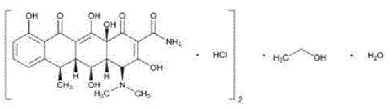 La doxiciclina ha un alto grado di solubilità lipidica e una bassa affinità per il legame del calcio. È altamente stabile nel normale siero umano. La doxiciclina non si degraderà in una forma di Epianhydro. La struttura chimica della doxiciclina igrata è mostrata nella Figura 1.