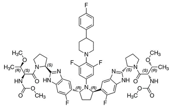 Il nome chimico di pibrentasvir è metilico {(2S3R) -1-[(2S) -2- {5-[(2R5R) -1- {35-difluoro-4 [4- (4-fluorofenil) piperidin-1-ill] fenyl} -5- (6-fluoro-2-{(2s) -1- [n- (metossyyl) -thhhhhth Eonyl] pirrolidin-2-il} -1H-benzimidazol-5-il) pirrolidin-2-ill] -6-fluoro-1hbenzimidazol-2-il} pirrolidin-1-ill] -3-metossi-1-oxobutan-2-il} carbamato.