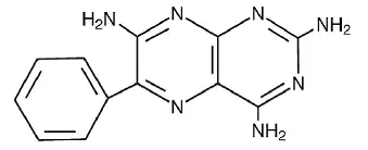 Il triamtene è 247-triamino-6-fenilpteridina. Il triamtene è praticamente insolubile nell'acqua benzene cloroformio etere e diluire gli idrossidi alcali. È solubile in acido formico e con parsimonia solubile in metossietanolo. Il triamtene è leggermente solubile in alcol di acido acetico e acidi minerali diluiti. Il suo peso molecolare è 253,27. La sua formula strutturale è: