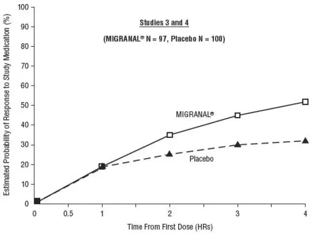 | *La figura mostra la probabilità nel tempo di ottenere una risposta dopo il trattamento con spray nasale migrano (diidroergotamina mesilato). La risposta al mal di testa è stata valutata su una scala a cinque punti che ha confuso la risposta al dolore e il ripristino della funzione per il dolore grave o inabile. I pazienti che non hanno raggiunto la risposta entro 4 ore sono stati censurati a 4 ore. |
