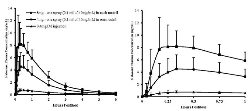 Il Naloxone TMAX mediano dopo la somministrazione intranasale di spray nasale Narcan (uno spray nasale in una narice o due spray nasali come uno spray in ciascuna narice non era significativamente diverso rispetto alla dose di 0,4 mg di iniezione intramuscolare di naloxone cloridrato (Tabella 1).