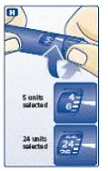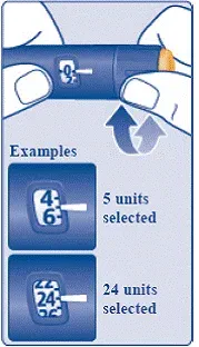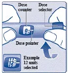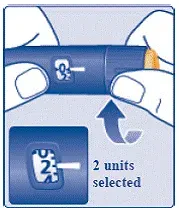 - Girare il selettore della dose in senso orario per selezionare la dose necessaria da iniettare (vedi Figura H). Il puntatore dovrebbe allinearsi con la tua dose. Quando si gira il selettore della dose, fai attenzione a non premere il pulsante Dose quando verrà fuori l'insulina. Sentirai un clic per ogni singola unità composta. Fare non Imposta la dose contando il numero di clic che ascolti perché potresti ottenere una dose errata.
