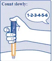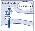 - Inserisci l'ago nella pelle. Premere e tenere premuto il pulsante Dose fino a quando il contatore della dose non mostra 0. Continue to keep the dose button pressed E keep the needle in your skin E conta lentamente fino a 6 (see Figura j).