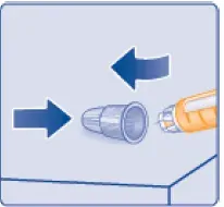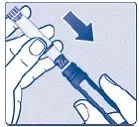 - Tirare fuori il cappuccio dell'ago esterno (Vedi Figura E). Fare non buttalo via. Ne avrai bisogno dopo l'iniezione per rimuovere in sicurezza l'ago.