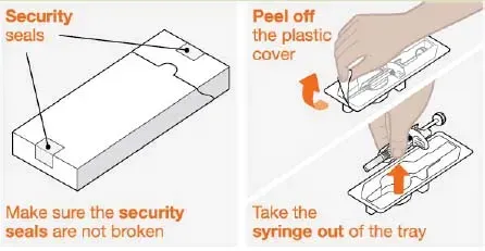 - Posizionare la siringa preimpegnata su una superficie piana pulita a temperatura ambiente lontano dalla luce solare diretta e fuori dalla portata dei bambini.