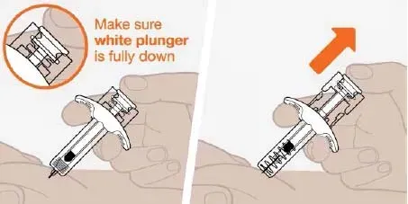 - Assicurati che lo stantuffo bianco sia spinto fino in fondo fino a quando il tappo non raggiunge il fondo della siringa e che tutta la medicina sia iniettata.