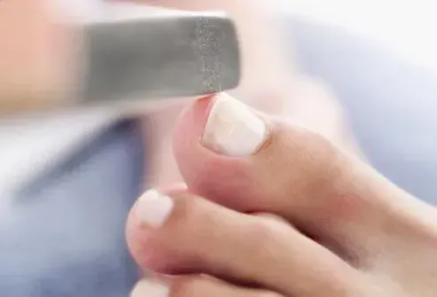 Tra le pedicure e l'altra taglia le unghie dei piedi dritti per tagliarle. Questo aiuta a prevenire le unghie dei piedi incarnite e le mantiene forti. Archiviare leggermente le unghie in modo che siano arrotondati al centro va bene. Prima di lucidare le unghie pulite delicatamente sotto di loro con un bastone di manicure. Se hai il diabete, il tuo operatore sanitario eseguirà esami regolari e ti insegnerà come prenderti cura dei tuoi piedi.