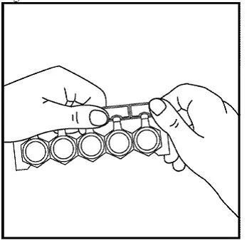 - Apri la busta di lamina sigillata lungo la linea tratteggiata ed elimina 1 ampola a dosi singola dalla striscia. Vedi Figura 1.
