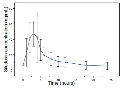 La farmacocinetica della silodosina è stata valutata in soggetti maschi adulti con dosi che vanno da 0,1 mg a 24 mg al giorno. La farmacocinetica della silodosina è lineare in questa gamma di dosaggio.