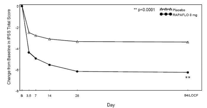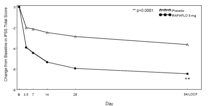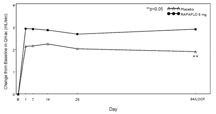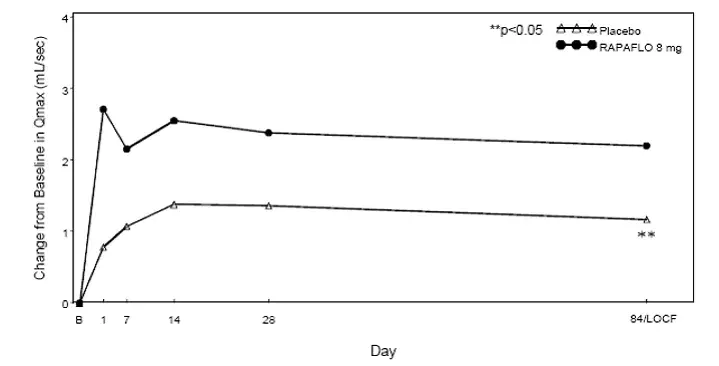 Rapaflo produced statistically significant increases in maximum urinary flow rates from baseline to last assessment (Week 12) versus placebo in both studies (Table 5 E Figures 4 E 5). Mean peak flow rate increased starting at the first scheduled observation at Day 1 E remained greater than the baseline flow rate through the 12 weeks of treatment for both studies.
