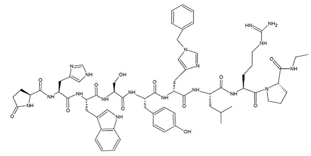 La formula molecolare per acetato di istrelina è C 66 H 86 N 18 O 12 x 2ch 3 COOH e il suo peso molecolare sono 1443,70 (o 1323,52 come base libera). L'istrelina è anche chimicamente descritta come 5-oxo-L-prolil-l-istidil-L-triptofil-lseryl-l-tirosil-nt-benzil-D-istidil-L-leucil-L-arginil-n-etile-l-prolinamide diacetato. La struttura chimica della base libera (istrelina) è rappresentata di seguito nella Figura 2.