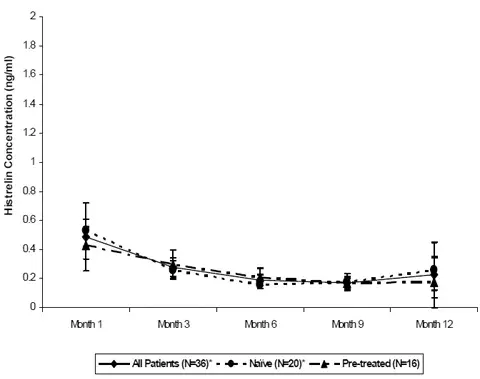 Farmacocinetica of histrelin after implantation of Supprelin IL was evaluated in a total of 47 children with CPP (11 subjects in Study 1 and 36 subjects in Study 2). Patients were examined at 4 weeks after implant insertion and a few times throughout the treatment period. Median serum histrelin concentrations remained above the limit of quantification for the treatment period. Histrelin acetate levels were sustained throughout the study period for most subjects (Figure 3). The median of maximum serum histrelin concentrations over the study period was 0.43 ng/mL which is expected to maintain gonadotropins at prepubertal levels. There was no apparent pharmacokinetic difference between naïve subjects to a LHRH agonist treatment and subjects who had previous treatment with a LHRH agonist (Figure 3).