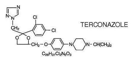Terconazolo Un derivato del triazolo è una polvere da bianco a quasi bianco con un peso molecolare di 532,47. È insolubile in acqua; con parsimonia solubile in etanolo; e solubile in butanolo.