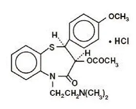 Tiazac® (diltiazem cloridrato) è un inibitore dell'afflusso cellulare ionico di calcio (bloccante del canale lento). Chimicamente diltiazem cloridrato è 15-benzotiazepin-4 (5H) -one 3- (acetiloxy) -5- [2- (dimetilammino) etil] -2 3-diidro-2- (4-metossifenil)-monoidrocloruro () -cis-. La struttura chimica è: