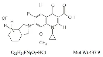 Nome chimico: 1-cyclopropil-6-fluoro-14-diidro-8-metossi-7-[(4as7as) -octahydro-6H-pirrololo [34b] piridin6-ill] -4-oxo-3-qitnolinecarbossilico monoidrocloristico. La moxifloxacina cloridrato è una polvere cristallina leggermente gialla a gialla. Ogni ml di soluzione Vigamox® contiene 5,45 mg di moxifloxacina cloridrato equivalente a 5 mg di base di moxifloxacina.