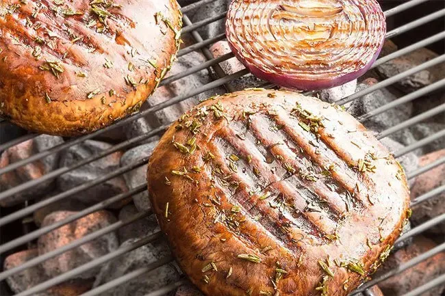 Per un'alternativa a una spazzola di carne Portabella Fungo con olio d'oliva e cuocili sulla griglia.