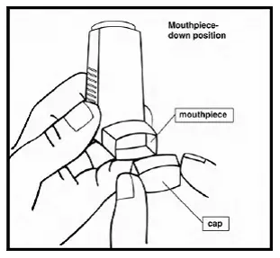 Passaggio 3: Tieni l'inalatore in posizione verticale con il bocchino che punta verso di te. Prima di mettere il bocchino in bocca espira attraverso la bocca E push out as much air from your lungs as you can (See Figura 6 ).