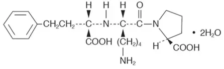Il lisinopril è un inibitore dell'enzima (ACE) di conversione dell'agiotensina a lungo termine orale. Lisinopril Un derivato del peptide sintetico è descritto chimicamente come (S) -1- [N2- (1-carbossy-3-fenilpropil) -L-lysyl] -lproline diidrato. La sua formula empirica è C 21 H 31 N 3 O 5 2h 2 O e la sua formula strutturale è: